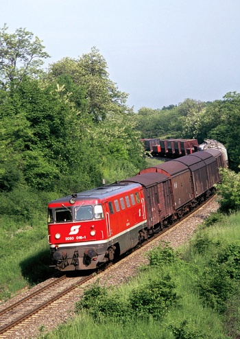 Do železniční stanice Marchegg přijíždí v čele nákladního vlaku motorová lokomotiva